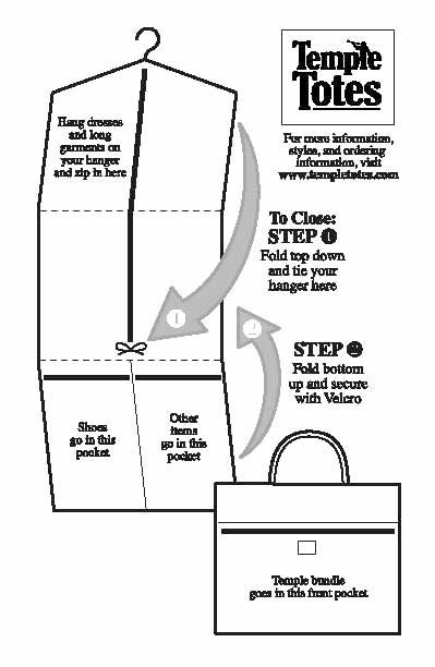 LDS Temple Bag made from various designer decorator prints and/or toile fabric for easy to use tote. The tri-fold garment bag with 3 pockets will keep your clothes looking their best. The 54" length will keep most dresses wrinkle free. Two roomy interior pockets are perfect for shoes, stockings, hankies and other personal items.