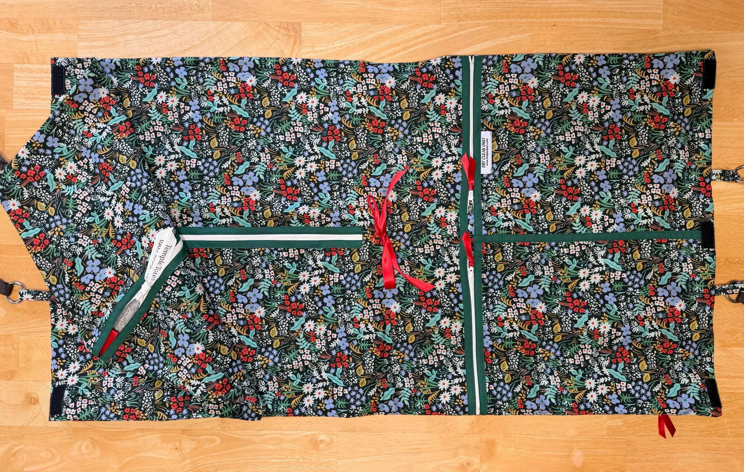 LDS Temple Bag made from various designer decorator prints and/or toile fabric for easy to use tote. The tri-fold garment bag with 3 pockets will keep your clothes looking their best. The 54" length will keep most dresses wrinkle free. Two roomy interior pockets are perfect for shoes, stockings, hankies and other personal items.