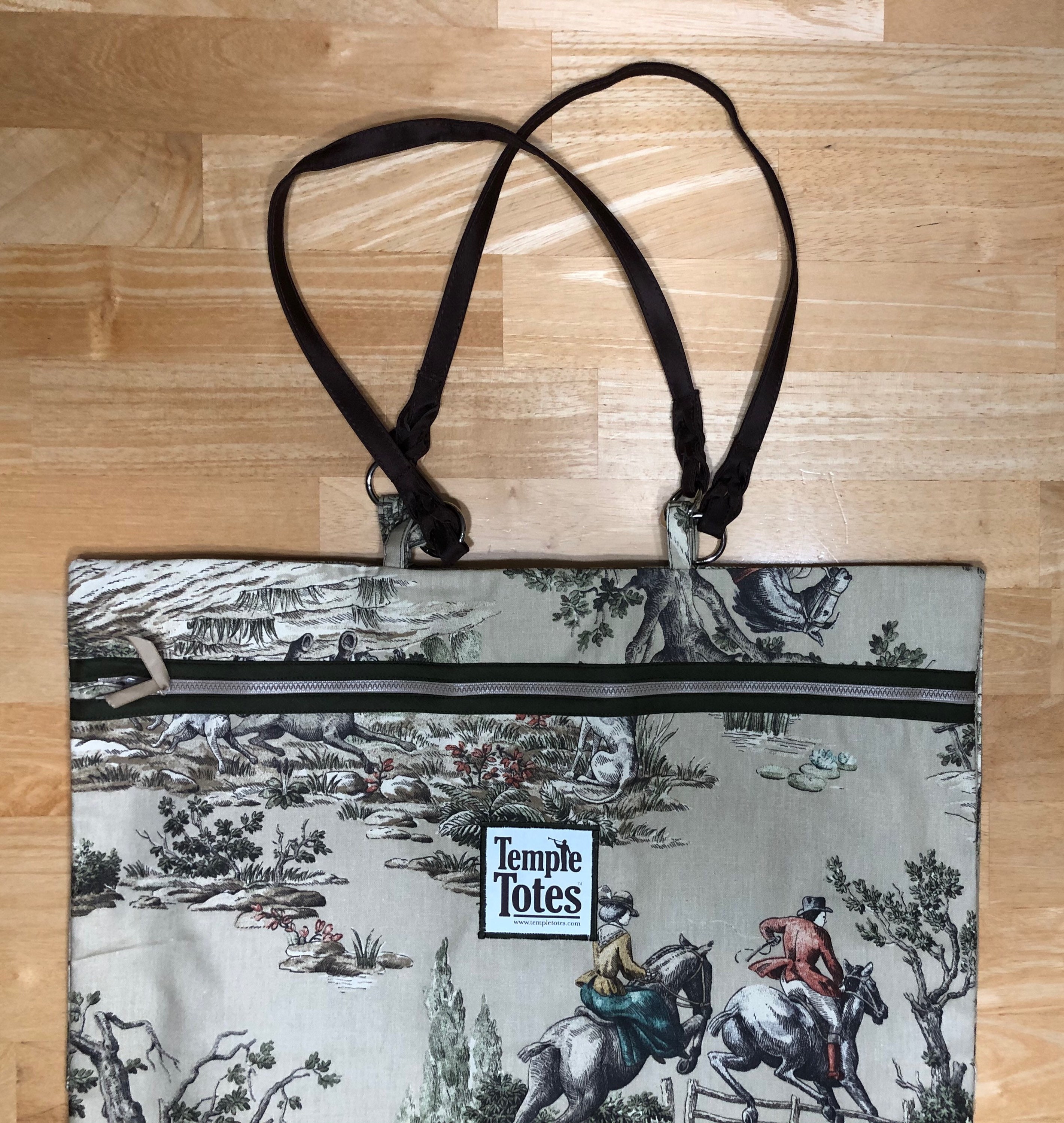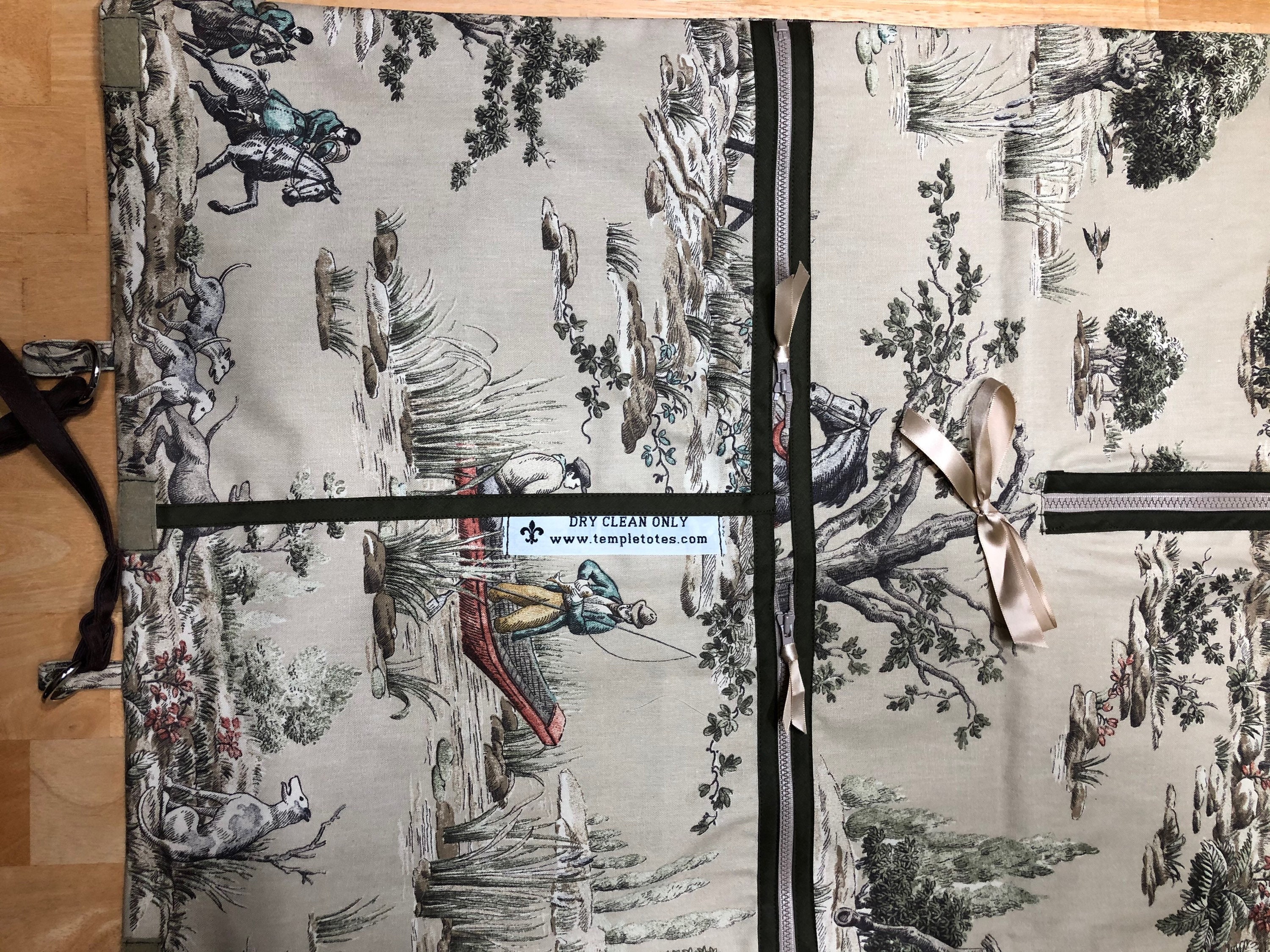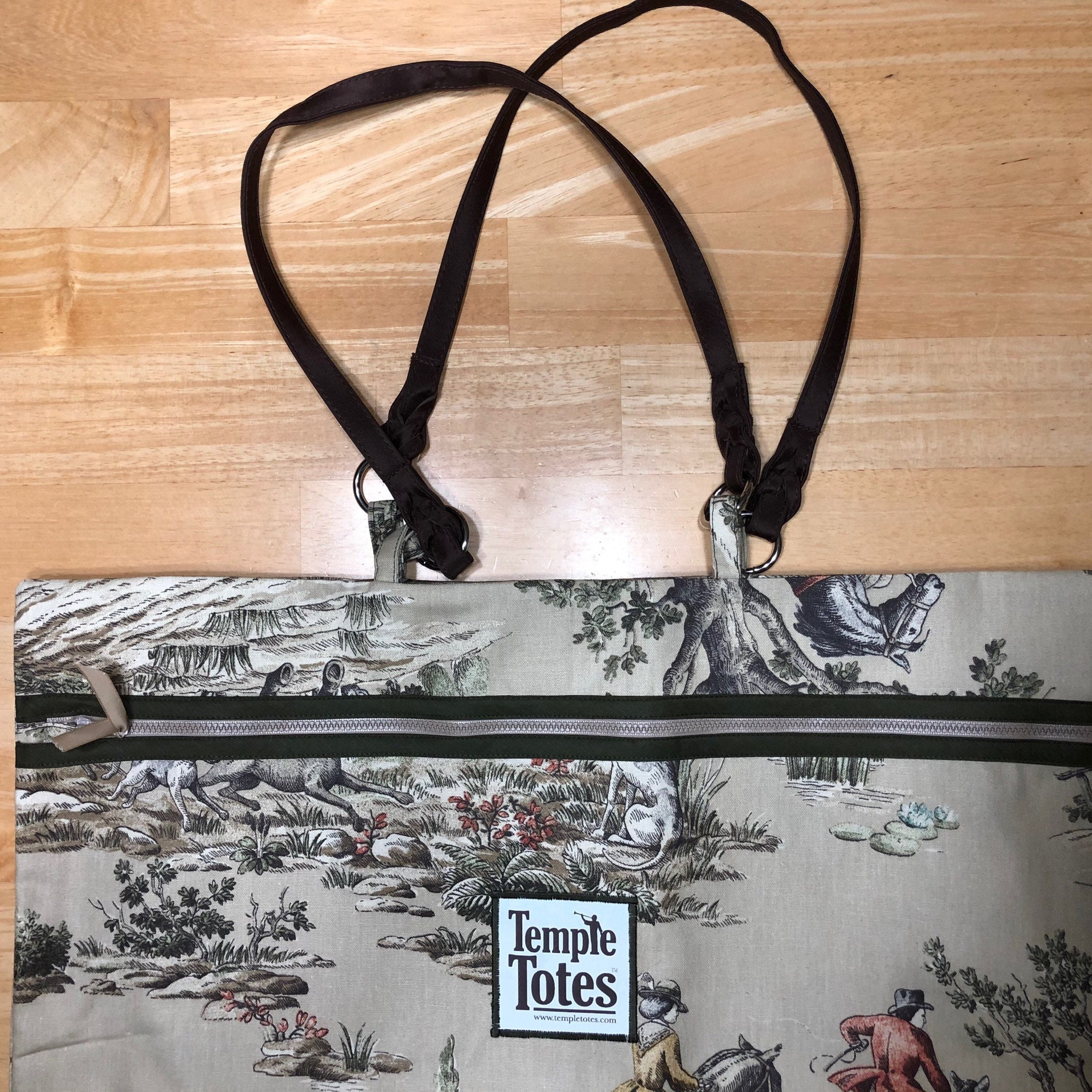 LDS Temple Bag made from various designer decorator prints and/or toile fabric for easy to use tote. The tri-fold garment bag with 3 pockets will keep your clothes looking their best. The 54" length will keep most dresses wrinkle free. Two roomy interior pockets are perfect for shoes, stockings, hankies and other personal items. A large exterior pocket is perfectly suited for your bundle. Folded size is approximately 21" w x 16" h with 22" handles